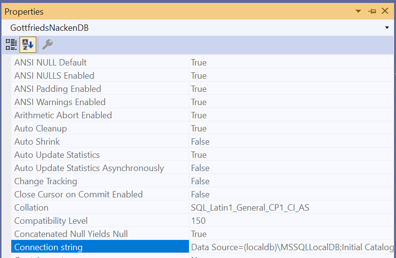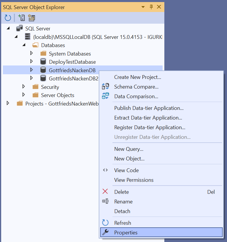 Öffne die Eigenschaften der oben erstellten Datenbank (Gehe im Server Explorer auf SQL Server -> (localdb)\MSSQLLocalDB, rechtsklick auf GottfriedsNackenDB (oder wie auch immer du sie genannt hast) und klicke auf Properties)