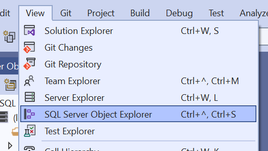 Öffne das SQL Server Object Explorer-Panel (View->SQL Server Object Explorer)