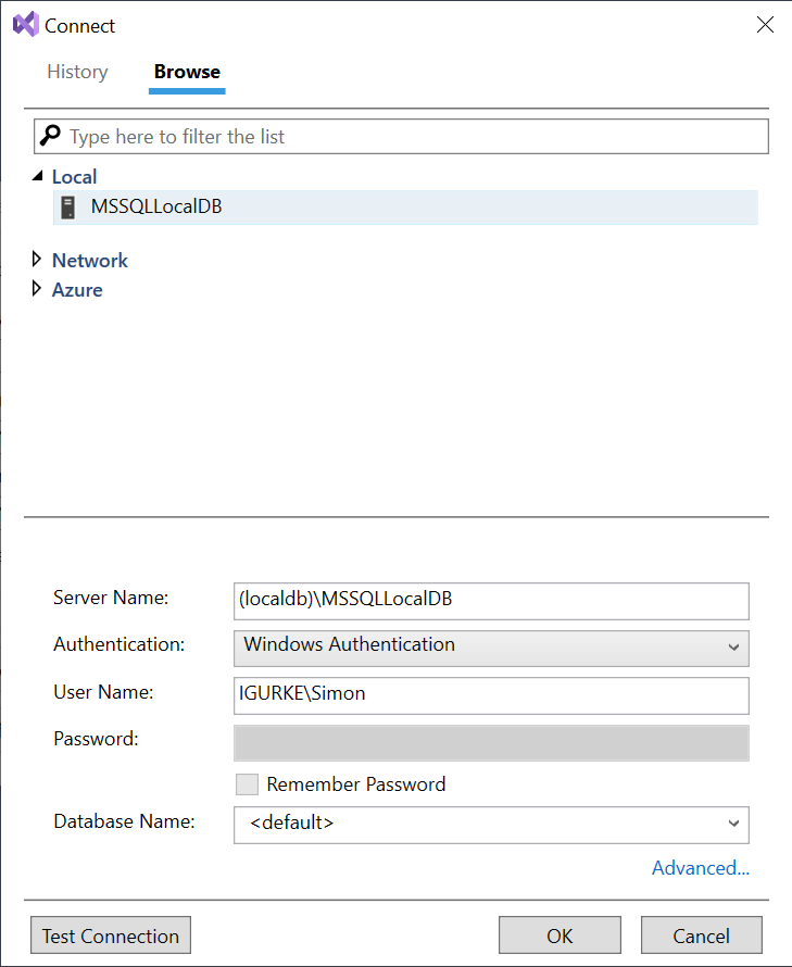 Wähle MSSQLLocalDB aus