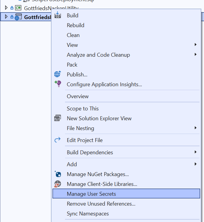 Wähle Manage User secrets