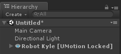 The bones and transforms of the animated GameObject need to match to those defined in the current project. When a new empty UMotion project is created and an animated GameObject is selected for the first time, a default configuration for all bones/transforms of that GameObject will be created. Important: While an animated GameObject is assigned to the Pose Editor it is not possible to select any other GameObjects through mouse clicks within the Scene View. In order to select other GameObjects, they need to be selected via Unity's Hierarchy window. GameObjects that are a parent or a child of the animated GameObject can't be selected. By clicking on the Clear button, the animated GameObject will be removed from the Pose Editor and its original state will be restored. Tip: By clicking on the Dropdown arrow next to the Clear button it is possible to remove the GameObject from the Pose Editor but keep the current pose in the scene. UMotion LockWhen an animated GameObject is selected, it automatically gets a component attached called UMotion Lock. This component saves the original state of the GameObject and prepares it for being used with UMotion. Once the animated GameObject field is cleared in the Pose Editor, UMotion Lock is destroyed which automatically restores the original state of the GameObject. Currently locked GameObjects are highlighted in the Unity Hierarchy window: