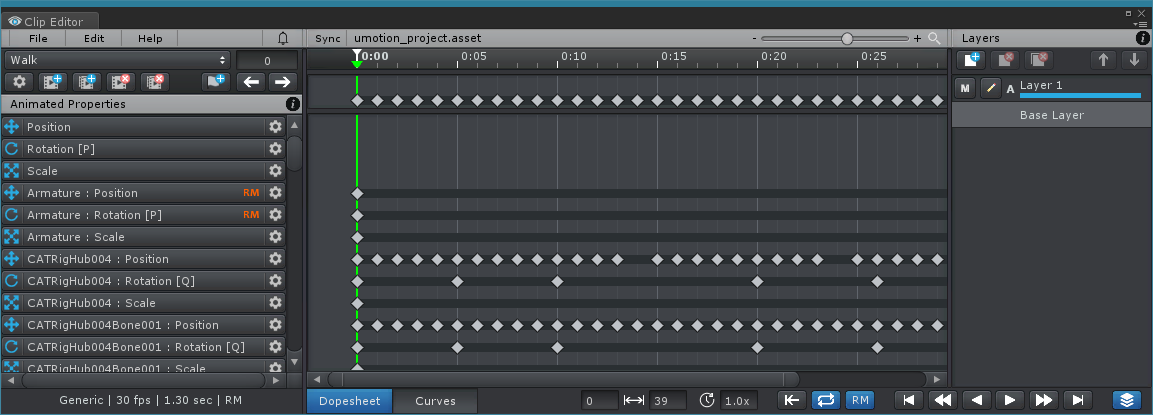 The Clip Editor is the main window of UMotion. It consists of the menu bar at the top, the Animated Property List on the left and the Dopesheet or Curve View (depending on the selected mode) on the right.