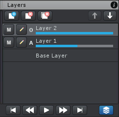 Each layer (except the base layer) has a blend weight displayed as blue slide bar underneath the layer name. The blend weight defines how much influence the layer has on the final animation.