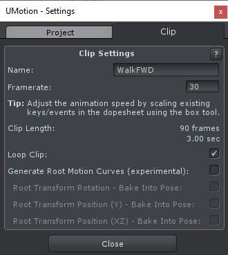 | Generate Root Motion Curves | When enabled, UMotion will generate the root motion curves for humanoid *.anim files directly instead of Unity. Use the settings below instead of the settings usually shown in the Inspector of the exported *.anim file. Not supported for projects of type generic or when exporting to *.FBX. |