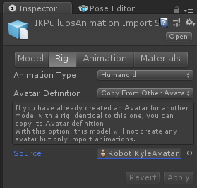 Depending on the original character's *.fbx this solution might not work (please choose a different one). - Use the Update Existing mode to export your animations into the character's original *.fbx (instead of exporting into separate *.fbx files). This will re-use the characters avatar. See Project Settings to learn more. Don't use this solution if you extended your character with other models (e.g. weapons, equipment).