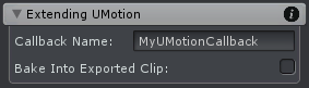| Bake Into Exported Clip | When enabled, the callback method is also called during the export process for every frame of the animation clip. That way the result of the components that extend UMotion's functionality are baked into the animation clip. Baking custom functionality into the animation clip reduces CPU load during runtime (if the components are removed from the GameObject). This functionality is only available in projects of type Humanoid. |