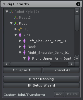 The Rig Hierarchy shows all joints and transforms that are configured in the current UMotion project. When a joint or transform is selected in the Rig Hierarchy window, it is automatically also selected in the Scene View and vice versa.