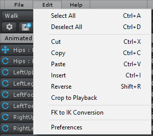 | Paste | Adds previously copied keys to the animation clip at the current selected frame. This will overwrite existing keys. |