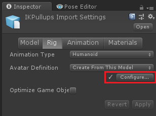 You can also manually correct the avatar configuration of your exported *.fbx files. This can introduce some small errors (depending on how well the T-Pose is configured, more on that later). Choose "Create From This Model" for the "Avatar Definition" setting. Click on Apply. Then click on "Configure" to open Unity's avatar configuration editor.