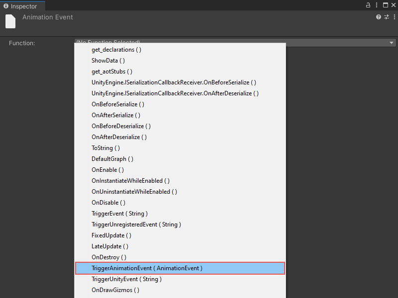 With the event selected, choose TriggerAnimationEvent as the function from the inspector.